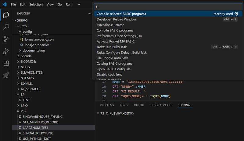 For UniData, different flavors are supported. Right-click in the file you want to compile then select "Compile BASIC programs". The language value from the basic.mvbasic.json file si read with the value set to: "ud_compile_flavor". See this section to set ud_compile_flavor value.